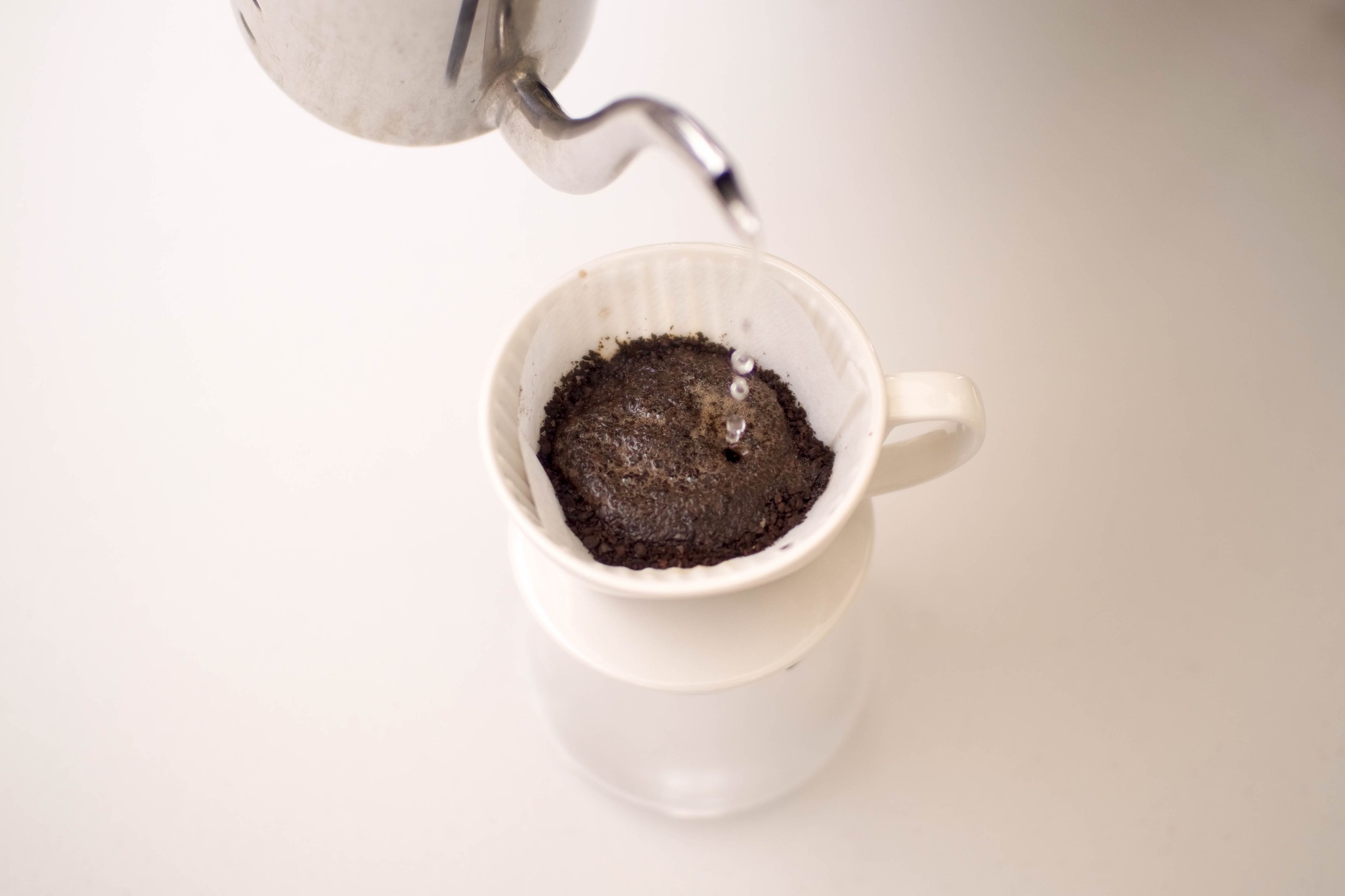 3. 蒸らしは、コーヒーに少量のお湯をそっと湿らすように注ぎ、カップに数滴落ちるぐらいにお湯を含ませてから、20秒ほどそのままにして蒸らします。